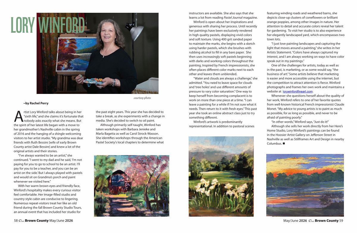 Whenever she questions herself about the quality of her work, Winford refers to one of her favorite quotes from well-known historical French impressionist Claude Monet.“ My advice to young artists is to paint as much as possible, for as long as possible, and never to be afraid of painting poorly.”“ In other words,” Winford says,“ Just do it!” Although she sells her work directly from her Here’ s Home Studio, Lory Winford’ s paintings can be found in the Hoosier Artist Gallery on Jefferson Street in Nashville as well as Stillframes Art and Design in nearby Columbus. •
