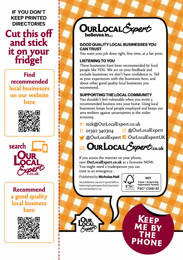 SUPPORTING THE LOCAL COMMUNITY You shouldn’ t feel vulnerable when you invite a recommended business into your home. Using local businesses keeps local people employed and keeps our area resilient against uncertainties in the wider economy. e: nick @ OurLocalExpert. co. uk t: 01392 340304