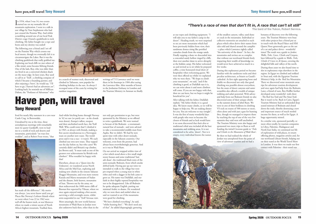 The following year a friend and I set off on the Pennine Way which crosses our local moors, though we eventually left it to circumnavigate the Lakes. But it was the climbing guidebook that really grabbed me. Exploring our local cliffs we met others of a like mind, some became lifelong friends. One of the lads, Roy, who was older than me lived in an a converted chicken shack on the moor edge. In later years, Roy used to call in at‘ Troll’, a climbing company of which I became a founding partner, and after enjoying a‘ brew’, he would say,“ I’ ll have to go, I haven’ t had an adventure yet”. Looking back, he reminds me of Millican Dalton, the“ Professor of Adventure” who in a search of warmer rock, discovered and climbed in Tafraoute, now popular for climbing holidays in the sun. As always I recouped some of the costs by writing for outdoor magazines. writings of T E Lawrence until we went there in his footsteps in 1984 after seeing the Lawrence film. After months of letters to the Jordanian Embassy in London and the Tourism Ministry in Amman we finally