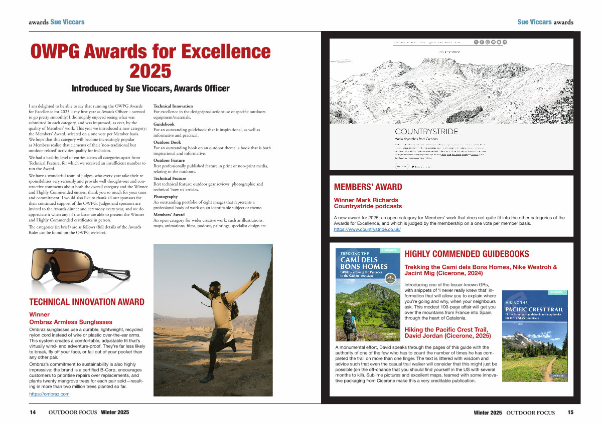 I am delighted to be able to say that running the OWPG Awards for Excellence for 2025 – my first year as Awards Officer – seemed to go pretty smoothly! I thoroughly enjoyed seeing what was submitted in each category, and was impressed, as ever, by the quality of Members’ work. This year we introduced a new category: the Members’ Award, selected on a one vote per Member basis. We hope that this category will become increasingly popular as Members realise that elements of their‘ non-traditional but outdoor-related’ activities qualify for inclusion.