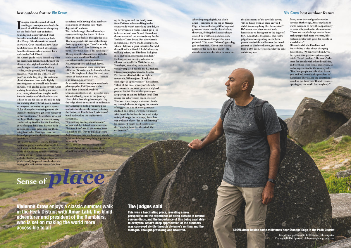 Later, as we descend gentler terrain towards Hathersage, Amar explains he wants everyone to have the opportunity to share this passion for the outdoors.“ There are simple things we can do to make people feel more welcome, like replacing stiles with gates for people in wheelchairs.” His work with the Ramblers and his visibility is also about changing perceptions.“ When you’ re blind, you have your own preconceptions – you think,‘ I can’ t do that’.” He says it’ s the same for people with other disabilities, and for those from ethnic minorities, all under-represented in the countryside.“ But then people see this blind Asian guy, and he’ s actually the president of Ramblers! They realise the countryside could be for them too. That drives me – opening up the world for everybody.” ing a new ing outside in natural f this being available on of the outdoors ne’ s writing and the autiful.