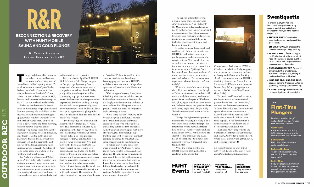 For Andy, a self-described introvert, the biggest reward of his whirlwind journey hasn’ t been the“ biohacking”— it’ s been the Berkshire connections.“ I think there’ s this need for communal spaces where social connection is fostered. I moved up here and didn’ t really have a network. When I host these pop-ups, it fills my cup from a social connection standpoint and its been really rewarding and fun.”