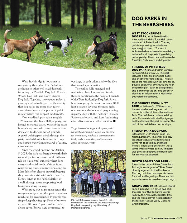 The park is fully managed and maintained by volunteers and funded through donations to the nonprofit Friends of the West Stockbridge Dog Park. As we head into spring, the work continues. We’ ll host a cleanup day once the snow melts, offer events and educational programming in partnership with the Berkshire Humane Society and others, and host fundraising efforts like a summer silent auction. n