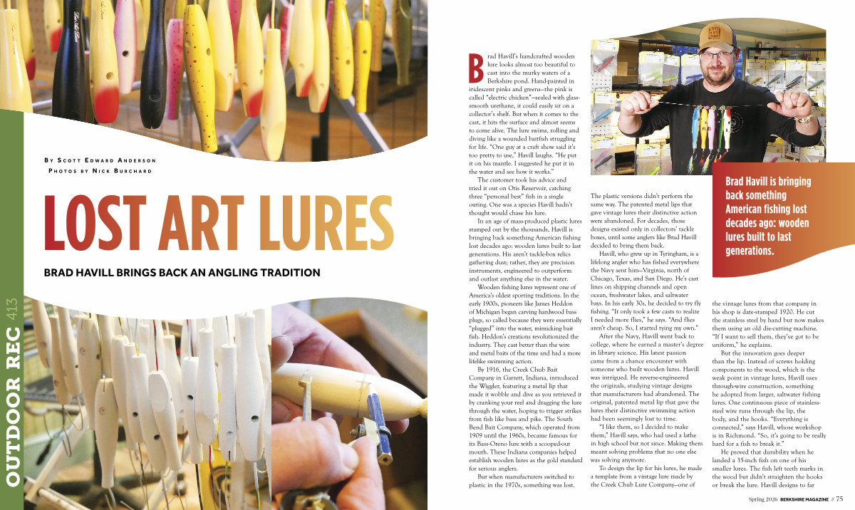 B rad Havill’ s handcrafted wooden lure looks almost too beautiful to cast into the murky waters of a Berkshire pond. Hand-painted in iridescent pinks and greens— the pink is called“ electric chicken”— sealed with glasssmooth urethane, it could easily sit on a collector’ s shelf. But when it comes to the cast, it hits the surface and almost seems to come alive. The lure swims, rolling and diving like a wounded baitfish struggling for life.“ One guy at a craft show said it’ s too pretty to use,” Havill laughs.“ He put it on his mantle. I suggested he put it in the water and see how it works.”