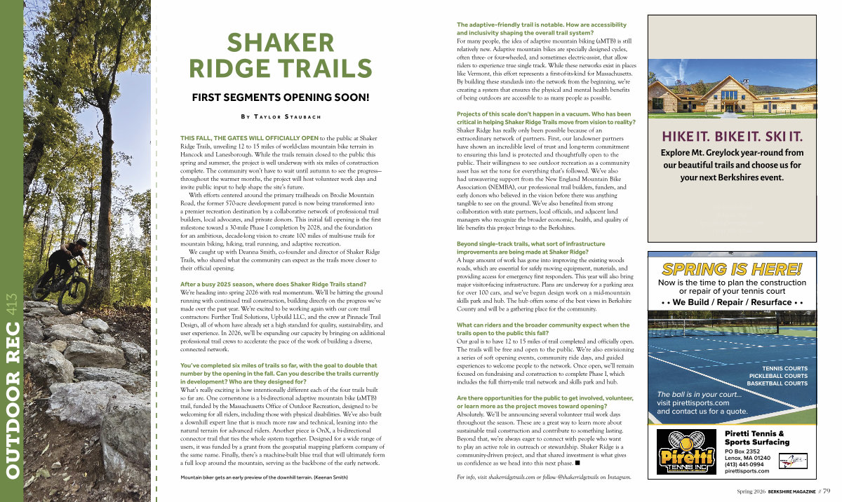THIS FALL, THE GATES WILL OFFICIALLY OPEN to the public at Shaker Ridge Trails, unveiling 12 to 15 miles of world-class mountain bike terrain in Hancock and Lanesborough. While the trails remain closed to the public this spring and summer, the project is well underway with six miles of construction complete. The community won’ t have to wait until autumn to see the progress— throughout the warmer months, the project will host volunteer work days and invite public input to help shape the site’ s future.