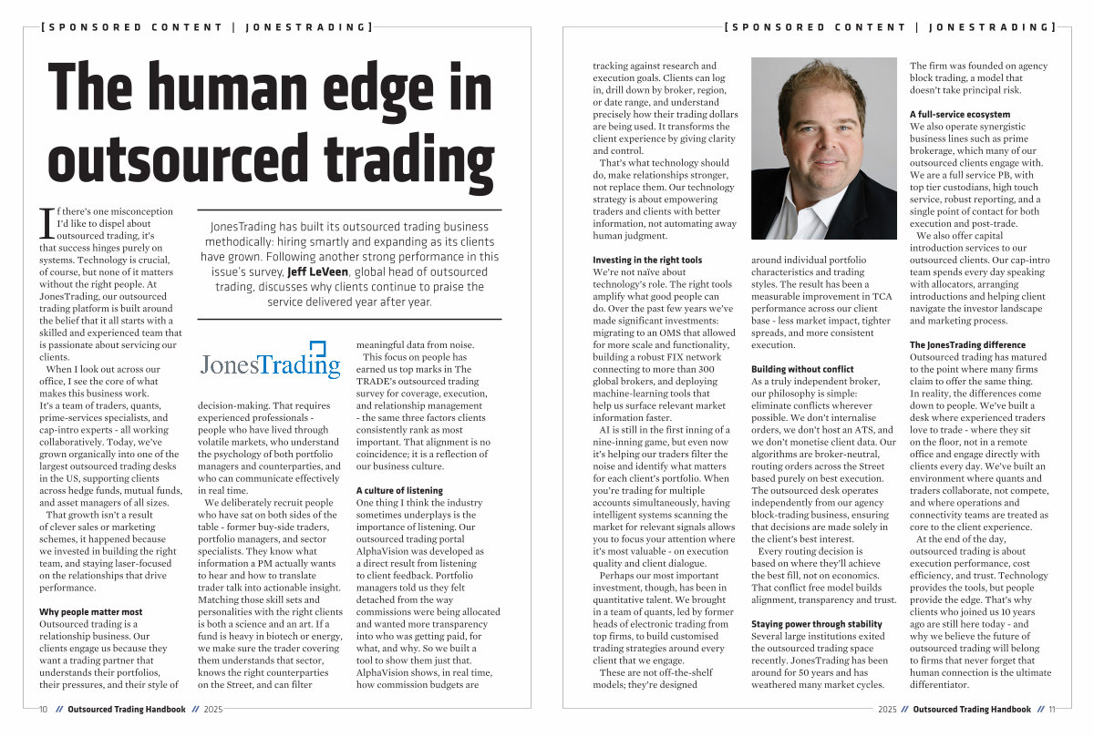 The JonesTrading difference Outsourced trading has matured to the point where many firms claim to offer the same thing. In reality, the differences come down to people. We’ ve built a desk where experienced traders love to trade- where they sit on the floor, not in a remote office and engage directly with clients every day. We’ ve built an environment where quants and traders collaborate, not compete, and where operations and connectivity teams are treated as core to the client experience.