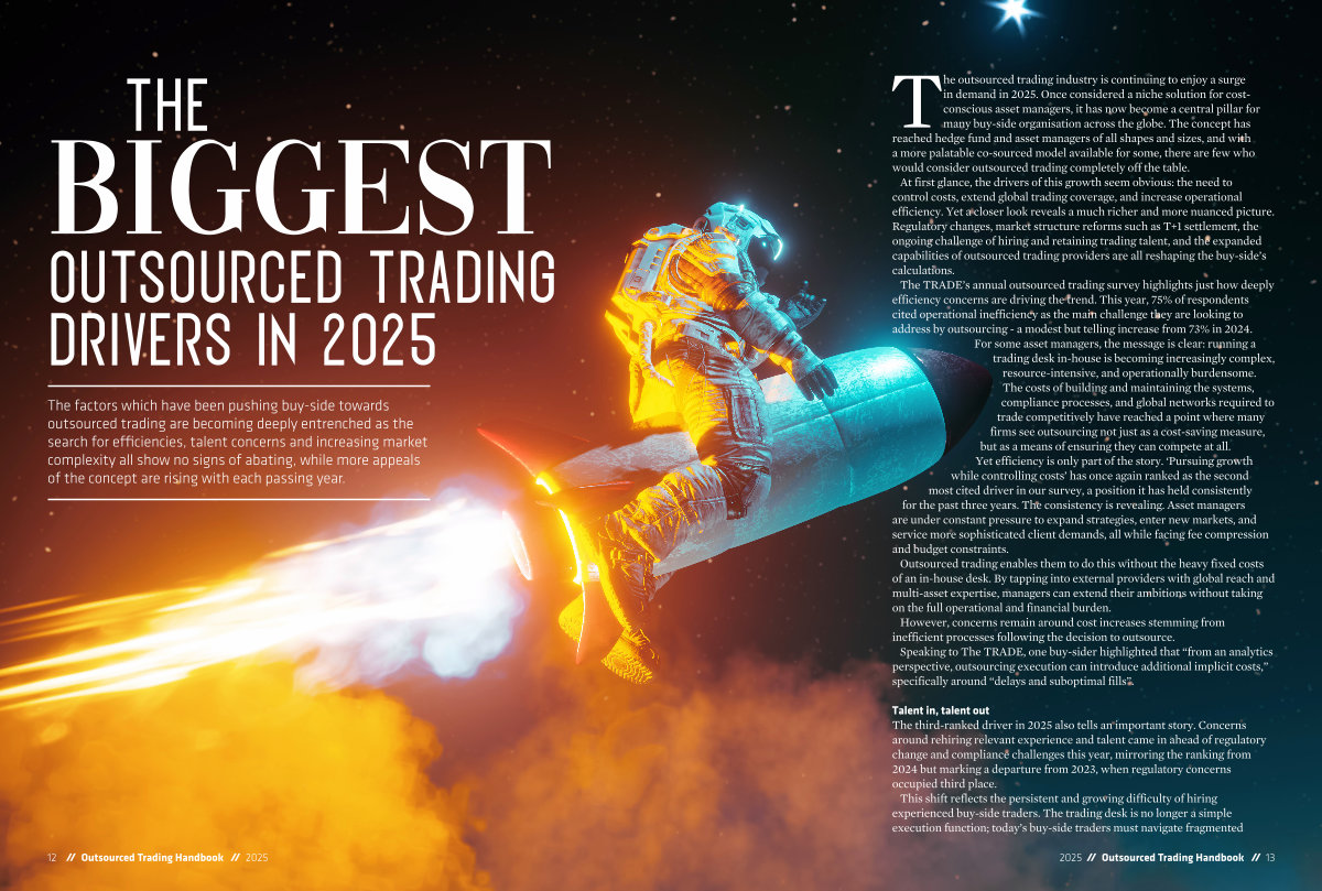 The TRADE’ s annual outsourced trading survey highlights just how deeply efficiency concerns are driving the trend. This year, 75 % of respondents cited operational inefficiency as the main challenge they are looking to address by outsourcing- a modest but telling increase from 73 % in 2024.