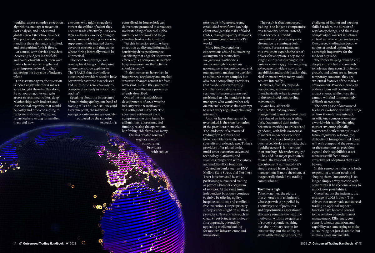 Overall across the industry, the message of 2025 is clear. The drivers that once made outsourced trading an optional support function have become central to the realities of modern asset management. Efficiency, cost control, talent, regulation, and capability are converging to make outsourcing not just desirable, but in many cases unavoidable.