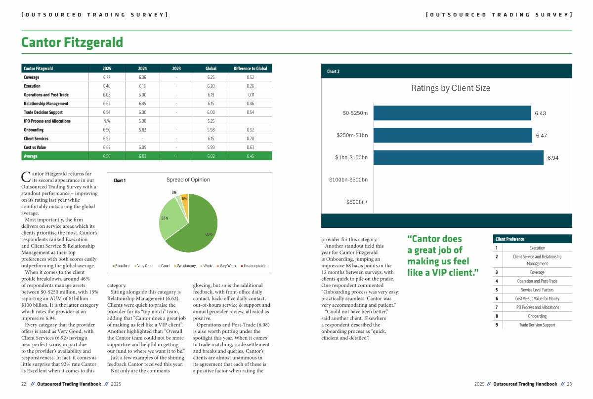 provider for this category. Another standout field this year for Cantor Fitzgerald is Onboarding, jumping an impressive 68 basis points in the 12 months between surveys, with clients quick to pile on the praise. One respondent commented“ Onboarding process was very easy: practically seamless. Cantor was very accommodating and patient.”“ Could not have been better,” said another client. Elsewhere a respondent described the onboarding process as“ quick, efficient and detailed”.