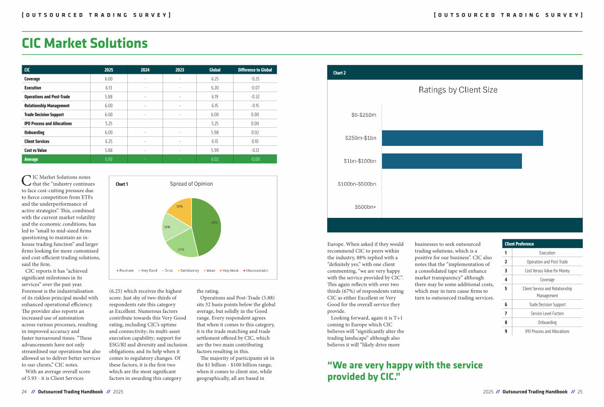 Europe. When asked if they would recommend CIC to peers within the industry, 88 % replied with a“ definitely yes,” with one client commenting,“ we are very happy with the service provided by CIC”. This again reflects with over two thirds( 67 %) of respondents rating CIC as either Excellent or Very Good for the overall service they provide. Looking forward, again it is T + 1 coming to Europe which CIC believes will“ significantly alter the trading landscape” although also believes it will“ likely drive more businesses to seek outsourced trading solutions, which is a positive for our business”. CIC also notes that the“ implementation of a consolidated tape will enhance market transparency” although there may be some additional costs, which may in turn cause firms to turn to outsourced trading services.