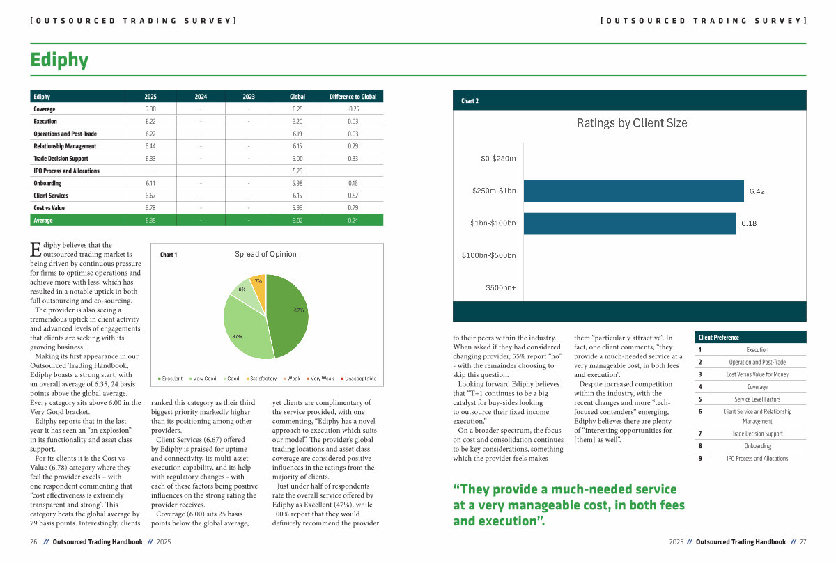 to their peers within the industry. When asked if they had considered changing provider, 55 % report“ no”- with the remainder choosing to skip this question. Looking forward Ediphy believes that“ T + 1 continues to be a big catalyst for buy-sides looking to outsource their fixed income execution.” On a broader spectrum, the focus on cost and consolidation continues to be key considerations, something which the provider feels makes them“ particularly attractive”. In fact, one client comments,“ they provide a much-needed service at a very manageable cost, in both fees and execution”. Despite increased competition within the industry, with the recent changes and more“ techfocused contenders” emerging, Ediphy believes there are plenty of“ interesting opportunities for [ them ] as well”.