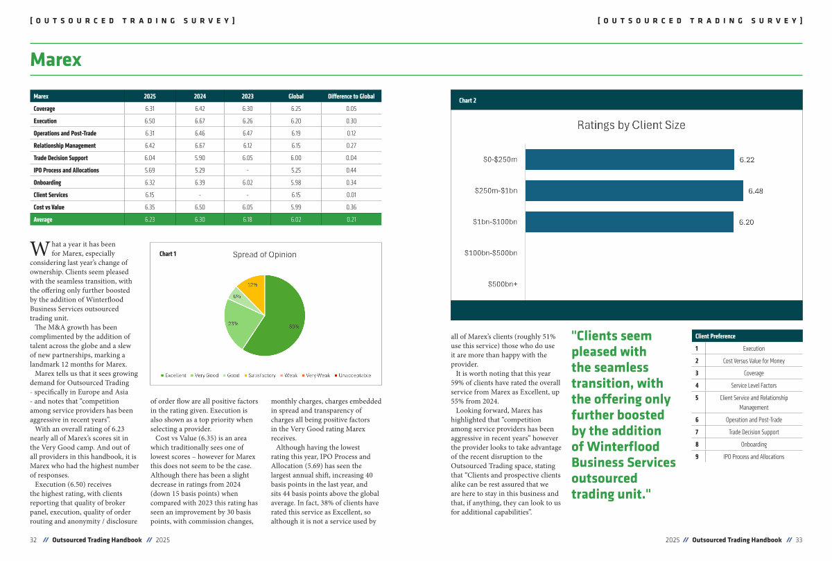of order flow are all positive factors in the rating given. Execution is also shown as a top priority when selecting a provider. Cost vs Value( 6.35) is an area which traditionally sees one of lowest scores – however for Marex this does not seem to be the case. Although there has been a slight decrease in ratings from 2024( down 15 basis points) when compared with 2023 this rating has seen an improvement by 30 basis points, with commission changes, monthly charges, charges embedded in spread and transparency of charges all being positive factors in the Very Good rating Marex receives. Although having the lowest rating this year, IPO Process and Allocation( 5.69) has seen the largest annual shift, increasing 40 basis points in the last year, and sits 44 basis points above the global average. In fact, 38 % of clients have rated this service as Excellent, so although it is not a service used by