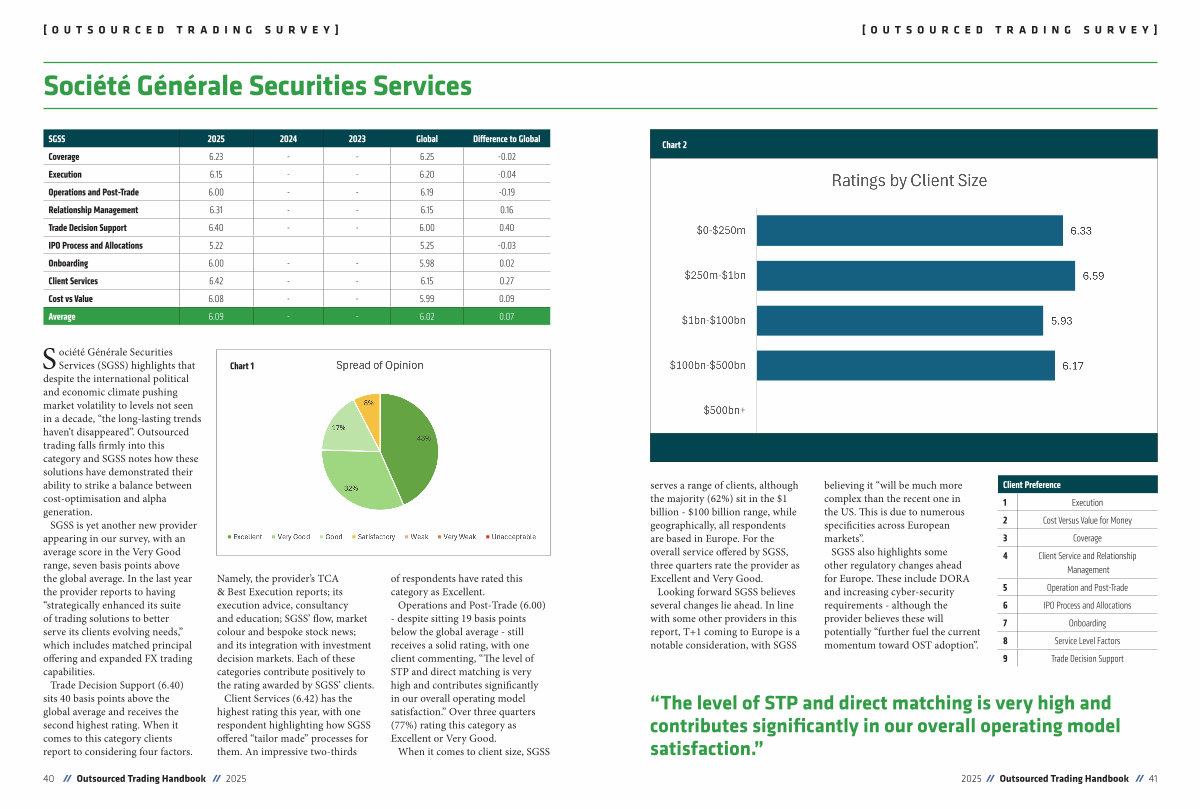 serves a range of clients, although the majority( 62 %) sit in the $ 1 billion- $ 100 billion range, while geographically, all respondents are based in Europe. For the overall service offered by SGSS, three quarters rate the provider as Excellent and Very Good. Looking forward SGSS believes several changes lie ahead. In line with some other providers in this report, T + 1 coming to Europe is a notable consideration, with SGSS believing it“ will be much more complex than the recent one in the US. This is due to numerous specificities across European markets”. SGSS also highlights some other regulatory changes ahead for Europe. These include DORA and increasing cyber-security requirements- although the provider believes these will potentially“ further fuel the current momentum toward OST adoption”.