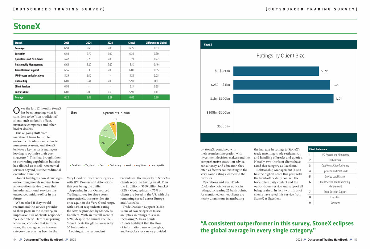 Over the last 12 months StoneX has been targeting what it considers to be“ non-traditional” clients such as family offices, insurance companies and other broker dealers. This ongoing shift from investment firms to turn to outsourced trading can be due to numerous reasons, and StoneX believes a key factor is managers looking to optimise their cost structure.“[ This ] has brought them to our trading capabilities but also has allowed us to sell incremental services beyond just the traditional execution function”. StoneX highlights how it envisages outsourcing models moving from an execution service to one that includes additional services like outsourced middle-office in the future. When asked if they would recommend the service provider to their peers in the industry, an impressive 83 % of clients responded“ yes, definitely”. Hardly surprising when you consider that in three years, the average score in every category bar one has been in the