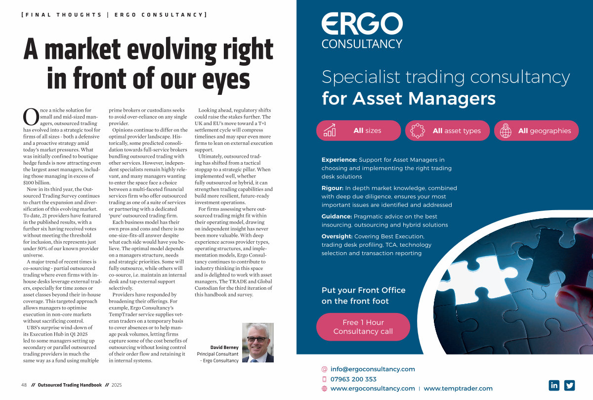 For firms assessing where outsourced trading might fit within their operating model, drawing on independent insight has never been more valuable. With deep experience across provider types, operating structures, and implementation models, Ergo Consultancy continues to contribute to industry thinking in this space and is delighted to work with asset managers, The TRADE and Global Custodian for the third iteration of this handbook and survey.