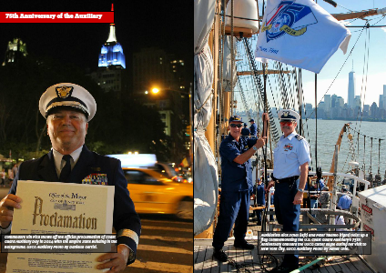 Commodore Vin Pica shows off the official proclamation of Coast Guard Auxiliary Day in 2014 with the Empire State Building in the background. USCG Auxiliary Photo by Daniella Garrisi.