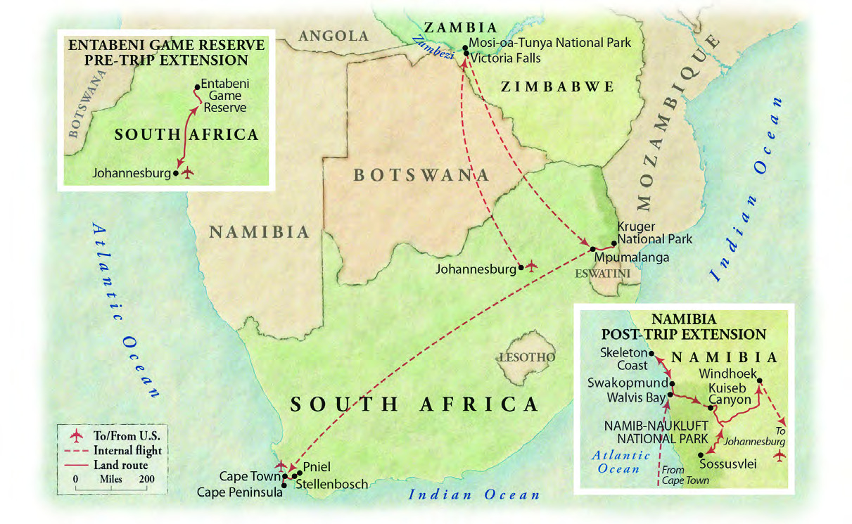 Zimbabwe: Victoria Falls | Zambia: Mosi-oa-Tunya National Park | South Africa: Kruger National Park, Stellenbosch, Cape Town