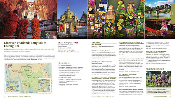 Exploring Thailand from the cosmopolitan south to the remote northern hill tribes, you’ ll witness Buddhist monks receiving alms at a dawn ceremony... walk alongside a jungle stream to a waterfall... and experience the bustle of Bangkok’ s floating market. You’ ll also get an insider’ s perspective into Thai culture as you spend A Day in the Life of Ban Na Sraloi Village, join a local family for a Home-Hosted Dinner, and more.