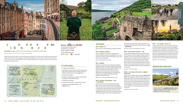 Rolling hills dotted with castles . Churches overlooking picturesque lochs . Cobbled streets winding through charming villages . The cities of Dundee , Glasgow , and Edinburgh , all blending the historic and the modern . This is Scotland — rich in history , legend , and atmosphere . Get an intimate glimpse into the country and meet the locals that call Scotland home along the way .