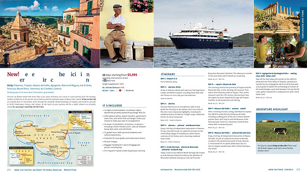 Discover an Italian island with more than 3,000 years of history on a coast-to-coast journey from the bustling markets of Palermo to the ancient city of Siracusa and the dramatic slopes of Mount Etna . Spend A Day in the Life on a family farm in Val di Noto , drive through the windmill-dotted landscape of Trapani , and immerse yourself in Sicily ’ s landscapes , history , and culture . At the heart of your journey will be 9 nights aboard our privately owned 89-passenger small ship , the M / V Clio .