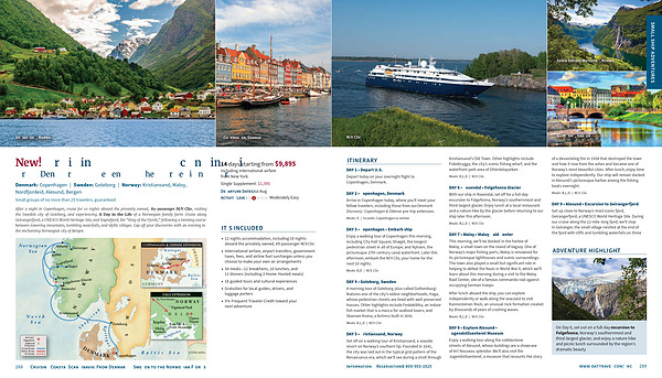 After a night in Copenhagen , cruise for 10 nights aboard the privately owned , 89-passenger M / V Clio , visiting the Swedish city of Goteborg , and experiencing A Day in the Life of a Norwegian family farm . Cruise along Geirangerfjord , a UNESCO World Heritage Site ; and Sognefjord , the “ King of the Fjords ,” following a twisting course between towering mountains , tumbling waterfalls , and idyllic villages . Cap off your discoveries with an evening in the enchanting Norwegian city of Bergen .
