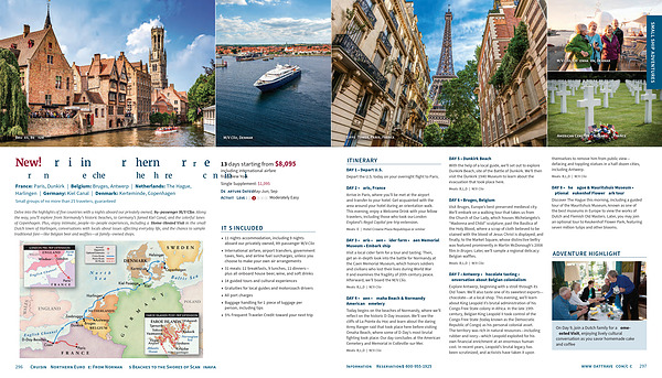 Delve into the highlights of five countries with 9 nights aboard our privately owned , 89-passenger M / V Clio . Along the way , you ’ ll explore from Normandy ’ s historic beaches , to Germany ’ s famed Kiel Canal , and the colorful lanes of Copenhagen . Plus , enjoy intimate , people-to-people experiences , including a Home-Hosted Visit in the small Dutch town of Harlingen , conversations with locals about issues affecting everyday life , and the chance to sample traditional fare — like Belgian beer and waffles — at family-owned shops .