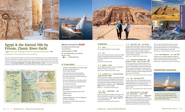 Discover the legacy of ancient Egypt — from the treasures of Tutankhamen to the tranquil enchantment of Aswan . Along with nine nights in historic hotels such as the iconic Winter Palace in Luxor that let you experience some of the romance and glamour of an earlier era , you ’ ll spend 5 nights aboard a privately chartered , 16-passenger dahabeya — the Asiya , Aida , Amunet , or Aton — and slowly drift along the Nile on a journey back in time to the days of the Pharaohs on this adventure of a lifetime .