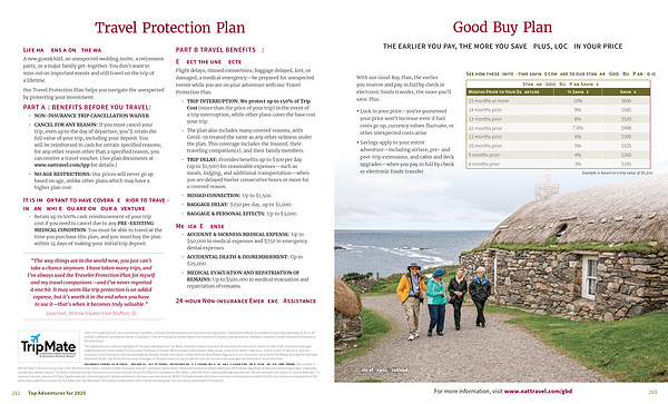 This advertisement contains highlights of the plans developed by Trip Mate , a Generali Global Assistance & Insurance Services brand , which include travel insurance coverages underwritten by United States Fire Insurance Company , Principal Office located in Morristown , New Jersey , under form series T7000 et al , T210 et al and TP-401 et al , and noninsurance Travel Assistance Services provided by Generali Global Assistance , FootprintID and Blue Ribbon Bags and a non-insurance Cancellation Fee Waiver provided by Overseas Adventure Travel . The terms of insurance coverages in the plans may vary by jurisdiction and not all insurance coverages are available in all jurisdictions .