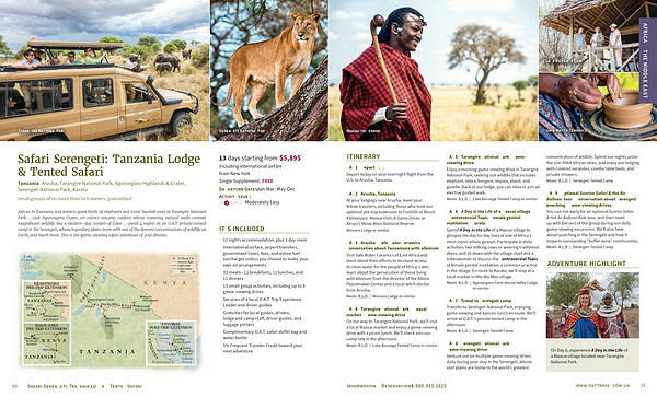 Join us in Tanzania and witness giant herds of elephants and iconic baobab trees in Tarangire National Park ... visit Ngorongoro Crater , an extinct volcanic caldera whose towering natural walls contain magnificent wildlife like a modern-day Garden of Eden ... spend 4 nights in an O . A . T . private tented camp in the Serengeti , whose legendary plains teem with one of the densest concentrations of wildlife on Earth , and much more . This is the game-viewing safari adventure of your dreams .