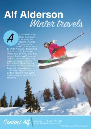 A lf Alderson is just back from some sea to sky ski touring in Arctic Norway on the island of Senja, prior to which his winter travels had included a road trip around Utah’ s best ski hills, a rail trip around Switzerland’ s best ski hills and an avalanche safety course in Verbier with the International Snow Training Academy. Words and pics on all these are now available.