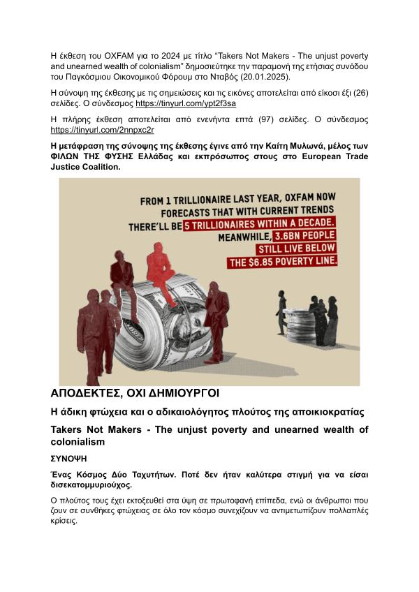 H έκθεση του OXFAM για το 2024 με τίτλο “ Takers Not Makers - The unjust poverty and unearned wealth of colonialism ” δημοσιεύτηκε την παραμονή της ετήσιας συνόδου του Παγκόσμιου Οικονομικού Φόρουμ στο Νταβός ( 20.01.2025 ).