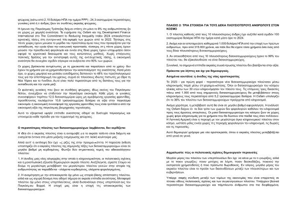 Η έρευνα της Παγκόσμιας Τράπεζας δείχνει επίσης ότι μόνο το 8 % της ανθρωπότητας ζει σε χώρες με χαμηλή ανισότητα . Τα ευρήματα της Oxfam και της Development Finance International στο The Commitment to Reducing Inequality Index 2024 αποκαλύπτουν αρνητικές τάσεις στη συντριπτική πλειοψηφία των χωρών από το 2022 . Τέσσερις στις πέντε χώρες έχουν μειώσει το μερίδιο του προϋπολογισμού τους που προορίζεται για την εκπαίδευση , την υγεία ή / και την κοινωνική προστασία , τέσσερις στις πέντε χώρες έχουν μειώσει την προοδευτική φορολογία και εννέα στις δέκα χώρες έχουν υποχωρήσει όσον αφορά τα εργασιακά δικαιώματα και τους κατώτατους μισθούς . Χωρίς επείγουσες πολιτικές δράσεις για την αντιστροφή αυτής της ανησυχητικής τάσης , η οικονομική ανισότητα θα συνεχίσει σχεδόν σίγουρα να αυξάνεται στο 90 % των χωρών .