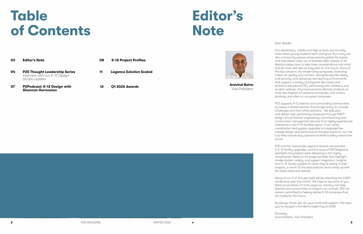P2S and the nationwide Legence network are partners in K-12 facility upgrades, and this issue of P2S Magazine spotlights the projects we’ re delivering in this highly varied sector. Read on for project profiles that highlight modernization, safety, and system integration, insights from K-12 Studio Leaders on what they’ re seeing in their projects, a new K-12 focused podcast and to keep up with the latest news and awards.