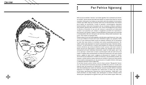 ossier Par Patrice Nganang P a r P a tr ic e N g a n a n g + Këtë muaj në rubrikën “dossier” nuk është zgjedhur fort rastësisht një shkrimtar afrikan. Vërtet shumë pak flitet për Afrikën në rajonin tonë dhe kur merret mundimi, bëhet për të na kujtuar se ajo është vatër sëmundjesh të tmerrshme si Ebola apo AIDS. Doja që të paktën këtë herë të fokusoheshim mbi Afrikën për të gjetur në kontinentin e madh, të ngrohtë e shumëngjyrës, shprehjen letraro-artistike, botën disi të panjohur për ne të popujve afrikanë, problemet dhe telashet, gëzimet dhe lumturinë e tyre. Them shumëngjyrësh jo për shkak të lëkurës së banorëve të saj, por për nuancat e panumërta që zbukurojnë veshjet e tyre popullore, për veshjen e magjishme që dielli në të perënduar i jep savanës, për puplat e zogjve të shumëllojshëm që fluturojnë mbi lumenjtë e rrëmbyeshëm dhe deri tek gurët, deri tek toka. Afrika është kontinenti i ngjyrave. Pak arrijnë ta kuptojnë këtë. Përpos kësaj, jo më kot është zgjedhur një shkrimtar nga Kameruni. Jam e sigurt se po të shikoni në hartë do të keni vështirësi ta gjeni, aq i panjohur është për ne. E pra, Kameruni është vendi me sistemin shtetëror më të korruptuar në botë dhe lejon kështu të zhvillohet një kulturë pandëshkueshmërie. Realiteti i sotëm atje shpaloset me fuqinë e pazakontë që kanë “dekretet administrative”, të cilat shumicën e rasteve janë pengesa të mëdha për çdo gazetë, revistë, shkrimtar apo artist që dëshiron të jetë i pavarur. Nuk kemi nevojë të flasim shumë për arbitraritetin e klasës politike apo shkallën dhe mënyrat e korrupsionit që kanë mbërthyer Kamerunin, sepse në këtë pjesë, jam e sigurt se përvoja e vendit tonë na lejon ta përfytyrojmë pikë për pikë atë që po ndodh. Të gjitha këto karakteristika të trishta për Kamerunin nuk janë arsyeja përse u zgjodh të ishte vendi i origjinës së shkrimtarit të “dossier”-it. Vërtet, ato mund të jenë ndihmesë e madhe në formimin e personalitetit artistik, por arsyeja e vërtetë është se sipas shumicës së kritikëve, Kameruni fsheh grupin më të madh të shkrimtarëve të rinj premtuesë në të gjithë Afrikën. Këtë grup e udhëheq pikërisht Patrice Nganang. Ai ka fituar shumë çmime letrare, mes të cilave çmimin “Marguerite Yourcenar” për shkrimtarët frankofonë që jetojnë në SHBA dhe çmimin e madh të Afrikës së zezë, për romanin e tij “Kohë qeni”. Po, tashmë Nganang jeton në New York dhe bashkëpunon vetëm me botuesë francezë, kjo për shkak të shkeljes flagrante të të drejtës së shprehjes që i është bërë, jo vetëm atij, nga vendi ku ka lindur, nga Kameruni. Romani që e bëri të famshëm, “Kohë qeni”, nuk është përkthyer në shqip. Madje, kam pështypjen se letërsia afrikane është shumë pak e përfaqësuar në gjuhën tonë, për të mos thënë aspak. Edhe unë, +