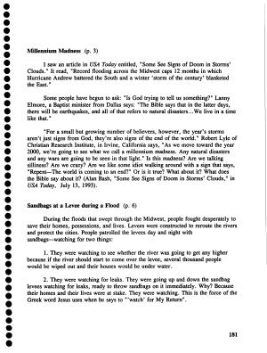 " For a small but growing number of believers , however , the year ' s storms aren ' t just signs from God , they ' re also signs of the end of the world ." Robert Lyle of Christian Research Institute , in Irvine , California says , " As we move toward the year 2000 , we ' re going to see what we call a millennium madness . Any natural disasters and any wars are going to be seen in that light . " Is this madness ? Are we talking silliness ? Are we crazy ? Are we like some idiot walking around with a sign that says ,