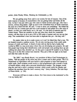 " By 1995 ," says Randy Boyett , vice president of Micro Card Technologies in Dallas , " half the people on the street may have a smart card in their pocket . The U . S . Department of Agriculture will soon launch a pilot program to issue food stamps as smart cards . Each recipient would receive a card programmed with a month ' s worth of benefit dollars , along with a personal identification number . The shopper would plug the card into a store ' s computer terminal , which would verify his identity and subtract the purchase from the card ' s memory chip ." ( Jerry Johnston , The Last Days of Planet Earth , p . 136 ).