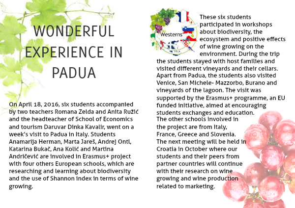 On April 18, 2016, six students accompanied by two teachers Romana Zelda and Anita Ružić and the headteacher of School of Economics and tourism Daruvar Dinka Kavalir, went on a week’s visit to Padua in Italy. Students Anamarija Herman, Marta Jareš, Andrej Ontl, Katarina Bukač, Ana Kolić and Martina Andričević are involved in Erasmus+ project with four others European schools, which are researching and learning about biodiversity and the use of Shannon index in terms of wine growing.