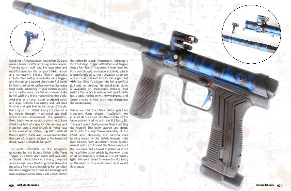 Speaking of Autocockers, Inception Designs makes some pretty amazing Autocockers. They do other stuff too, like upgrades and modifications for the Eclipse EMek. Simon and company’ s Eclipse EMek upgrades include their metal, adjustable Fang trigger and the cut and carved aluminum FLE body kit that is delivered with a low-rise clamping feed neck, matching metal detent covers and a multi-piece, ported aluminum Stella barrel with the front matched to the body. Available in a long list of anodized color and style options like matte and polished finishes and splashes to suit anyone’ s style, the Eclipse FLE EMek body kit caused a big ripple through mechanical paintball when it was announced. The question, then, becomes an obvious one: the Eclipse EMek is a hell of a gun for the money, and Inception cuts a nice chunk of metal, but is the sum of an EMek upgraded with all the Inception parts and pieces more than the sum of its parts, or just a five hundred dollar, two hundred dollar gun?