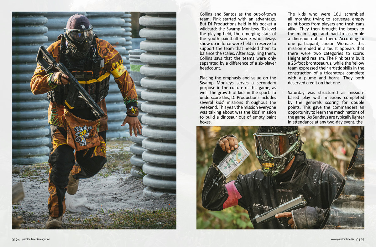 Collins and Santos as the out-of-town team, Pink started with an advantage. But DJ Productions held in his pocket a wildcard: the Swamp Monkeys. To level the playing field, the emerging stars of the youth paintball scene who always show up in force were held in reserve to support the team that needed them to balance the scales. After acquiring them, Collins says that the teams were only separated by a difference of a six-player headcount.