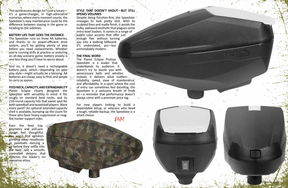 THE FINAL WORD The Planet Eclipse Protoyz Speedster is a loader that understands its audience. It doesn’ t try to dazzle you with unnecessary bells and whistles. Instead, it delivers what matters: reliability, speed, ease of maintenance, and affordability. In a sport where the cost of entry can sometimes feel daunting, the Speedster is a welcome breath of fresh air— a reminder that performance doesn’ t always come with a premium price tag.