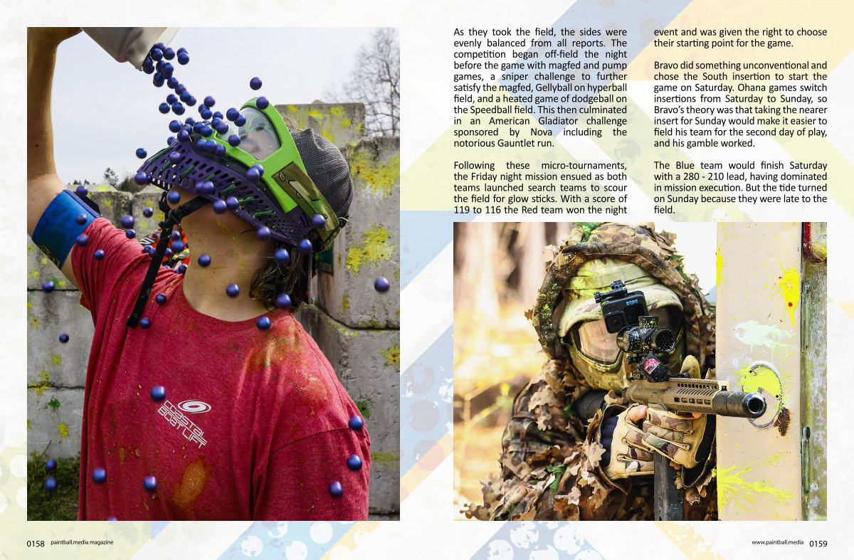 The Blue team would finish Saturday with a 280- 210 lead, having dominated in mission execution. But the tide turned on Sunday because they were late to the field. www. paintball. media