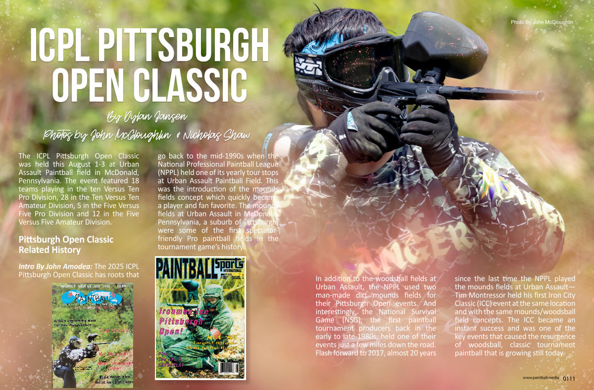 In addition to the woodsball fields at Urban Assault, the NPPL used two man-made dirt mounds fields for their Pittsburgh Open events. And interestingly, the National Survival Game( NSG), the first paintball tournament producers back in the early to late-1980s, held one of their events just a few miles down the road. Flash forward to 2017, almost 20 years since the last time the NPPL played the mounds fields at Urban Assault— Tim Montressor held his first Iron City Classic( ICC) event at the same location and with the same mounds / woodsball field concepts. The ICC became an instant success and was one of the key events that caused the resurgence of woodsball, classic tournament paintball that is growing still today.