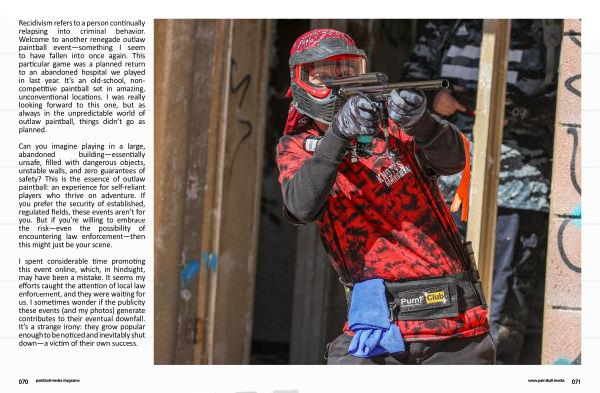 Recidivism refers to a person continually relapsing into criminal behavior . Welcome to another renegade outlaw paintball event — something I seem to have fallen into once again . This particular game was a planned return to an abandoned hospital we played in last year . It ’ s an old-school , noncompetitive paintball set in amazing , unconventional locations . I was really looking forward to this one , but as always in the unpredictable world of outlaw paintball , things didn ’ t go as planned .