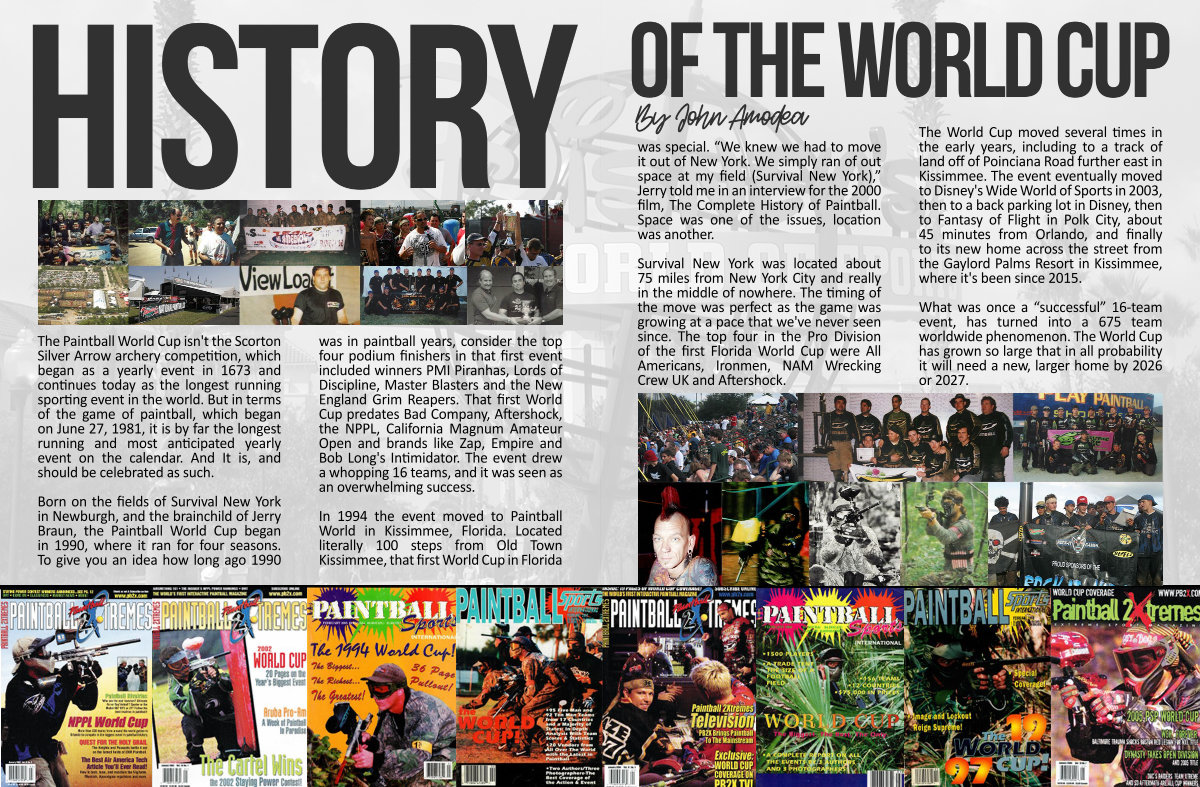 Born on the fields of Survival New York in Newburgh, and the brainchild of Jerry Braun, the Paintball World Cup began in 1990, where it ran for four seasons. To give you an idea how long ago 1990 was in paintball years, consider the top four podium finishers in that first event included winners PMI Piranhas, Lords of Discipline, Master Blasters and the New England Grim Reapers. That first World Cup predates Bad Company, Aftershock, the NPPL, California Magnum Amateur Open and brands like Zap, Empire and Bob Long ' s Intimidator. The event drew a whopping 16 teams, and it was seen as an overwhelming success.