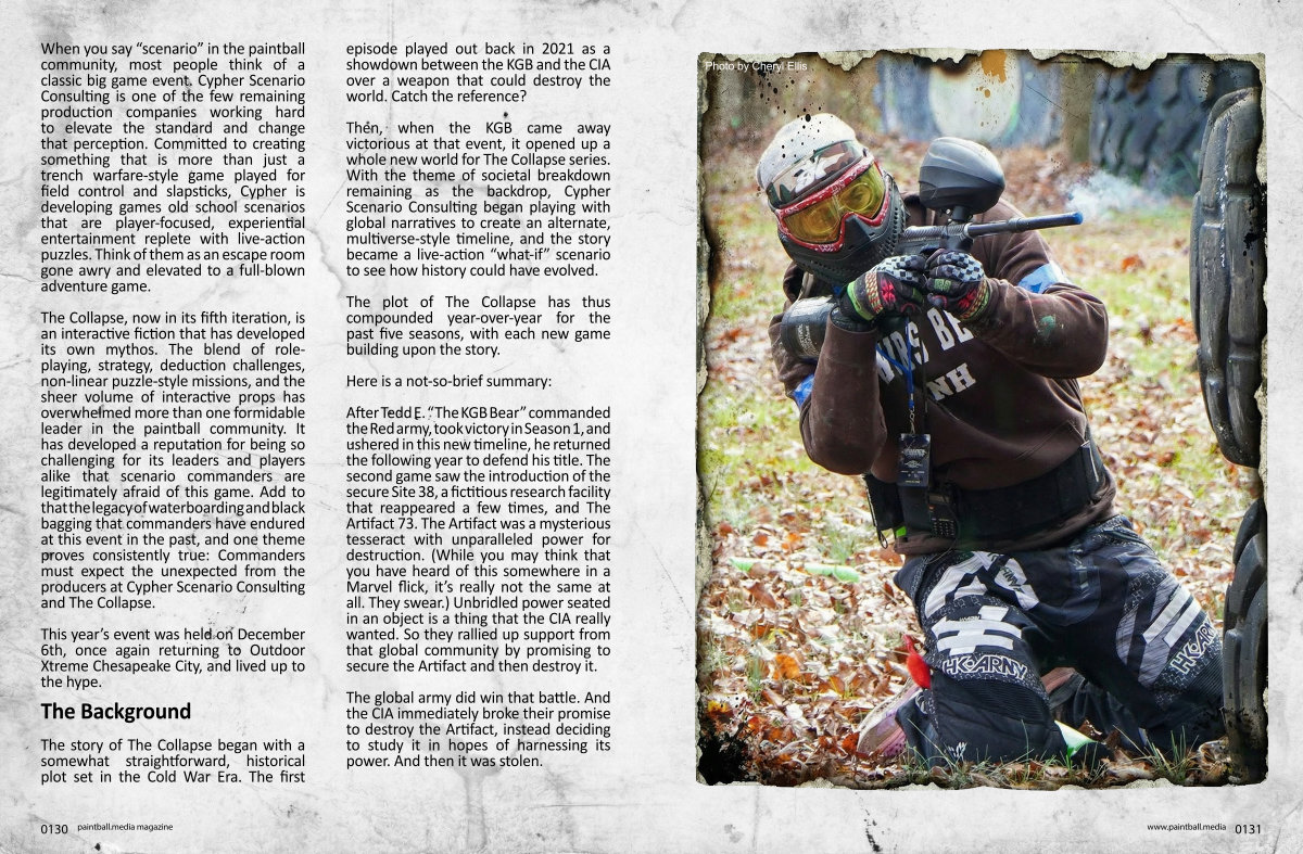 The Collapse, now in its fifth iteration, is an interactive fiction that has developed its own mythos. The blend of roleplaying, strategy, deduction challenges, non-linear puzzle-style missions, and the sheer volume of interactive props has overwhelmed more than one formidable leader in the paintball community. It has developed a reputation for being so challenging for its leaders and players alike that scenario commanders are legitimately afraid of this game. Add to that the legacy of waterboarding and black bagging that commanders have endured at this event in the past, and one theme proves consistently true: Commanders must expect the unexpected from the producers at Cypher Scenario Consulting and The Collapse.
