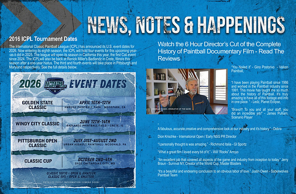 The International Classic Paintball League( ICPL) has announced its U. S. event dates for 2026. Now entering its eighth season, the ICPL will hold four events for this upcoming year--as it did in 2025. The league will open its season in California this year, the first Cali event since 2024. The ICPLwill also be back at Renick Miller ' s Badlandz in Crete, Illinois this season after a one-year hiatus. The third and fourth events will take place in Pittsburgh and Maryland respectively. See the full details below.