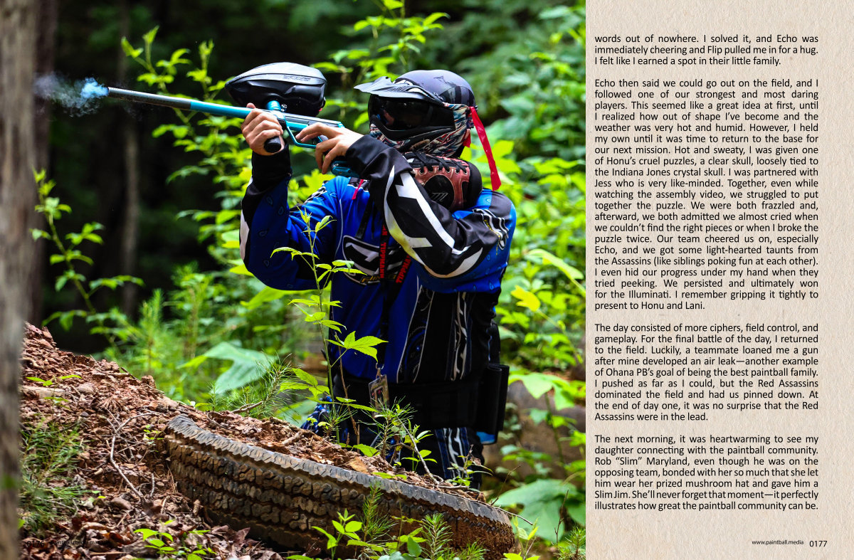 The day consisted of more ciphers, field control, and gameplay. For the final battle of the day, I returned to the field. Luckily, a teammate loaned me a gun after mine developed an air leak— another example of Ohana PB’ s goal of being the best paintball family. I pushed as far as I could, but the Red Assassins dominated the field and had us pinned down. At the end of day one, it was no surprise that the Red Assassins were in the lead.