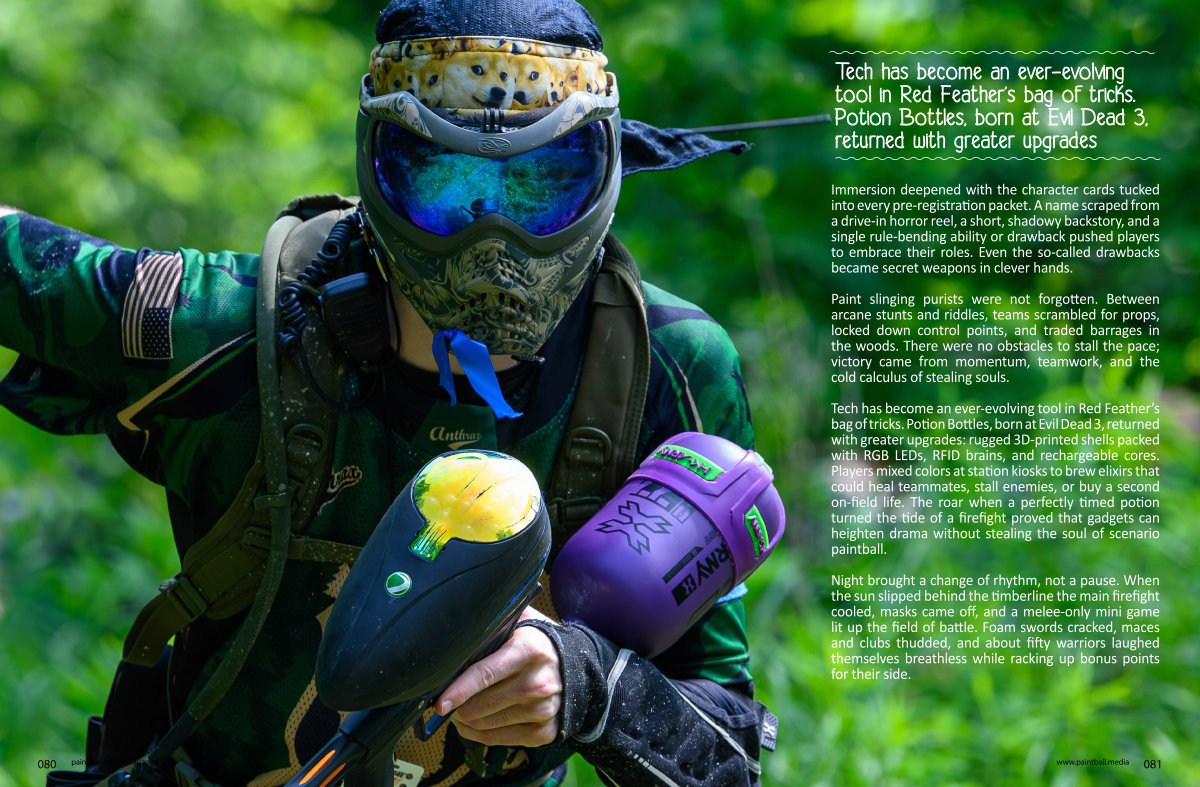 Tech has become an ever-evolving tool in Red Feather’ s bag of tricks. Potion Bottles, born at Evil Dead 3, returned with greater upgrades: rugged 3D-printed shells packed with RGB LEDs, RFID brains, and rechargeable cores. Players mixed colors at station kiosks to brew elixirs that could heal teammates, stall enemies, or buy a second on-field life. The roar when a perfectly timed potion turned the tide of a firefight proved that gadgets can heighten drama without stealing the soul of scenario paintball.