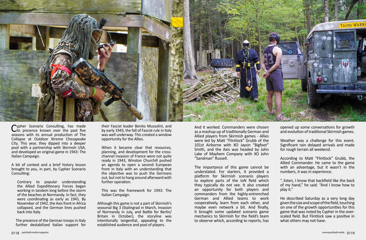 Cypher Scenario Consulting, has made its presence known over the past five seasons with its annual production of The Collapse at Outdoor Xtreme Chesapeake City. This year, they dipped into a deeper pool with a partnership with Skirmish USA, and developed an original game in 1943: The Italian Campaign.