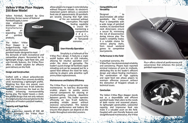The Valken V-Max Plus + Hopper stands out as a dependable and efficient paintball loader that caters to the needs of both novice and seasoned players . Its lightweight construction , substantial capacity , and impressive feed rate make it a valuable asset on the field . Coupled with user-friendly features and straightforward maintenance , the V-Max www . paintball . media